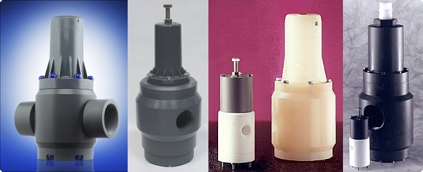 Corrosion resistant, also excellent for high purity and water applications. The standard connections are female NPT threaded ports. Socket, flanged and spigot connections are also available. Springs (not wetted) are steel. Adjusting bolts and external fasteners are stainless steel. Optional Xylan coated springs and fasteners available; consult factory. Some Kynar PVDF components are used in the Natural Polypropylene and PTFE models for strength. Adjusting bolt and lock nut on 3" pressure regulator is HDPE.
